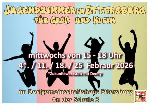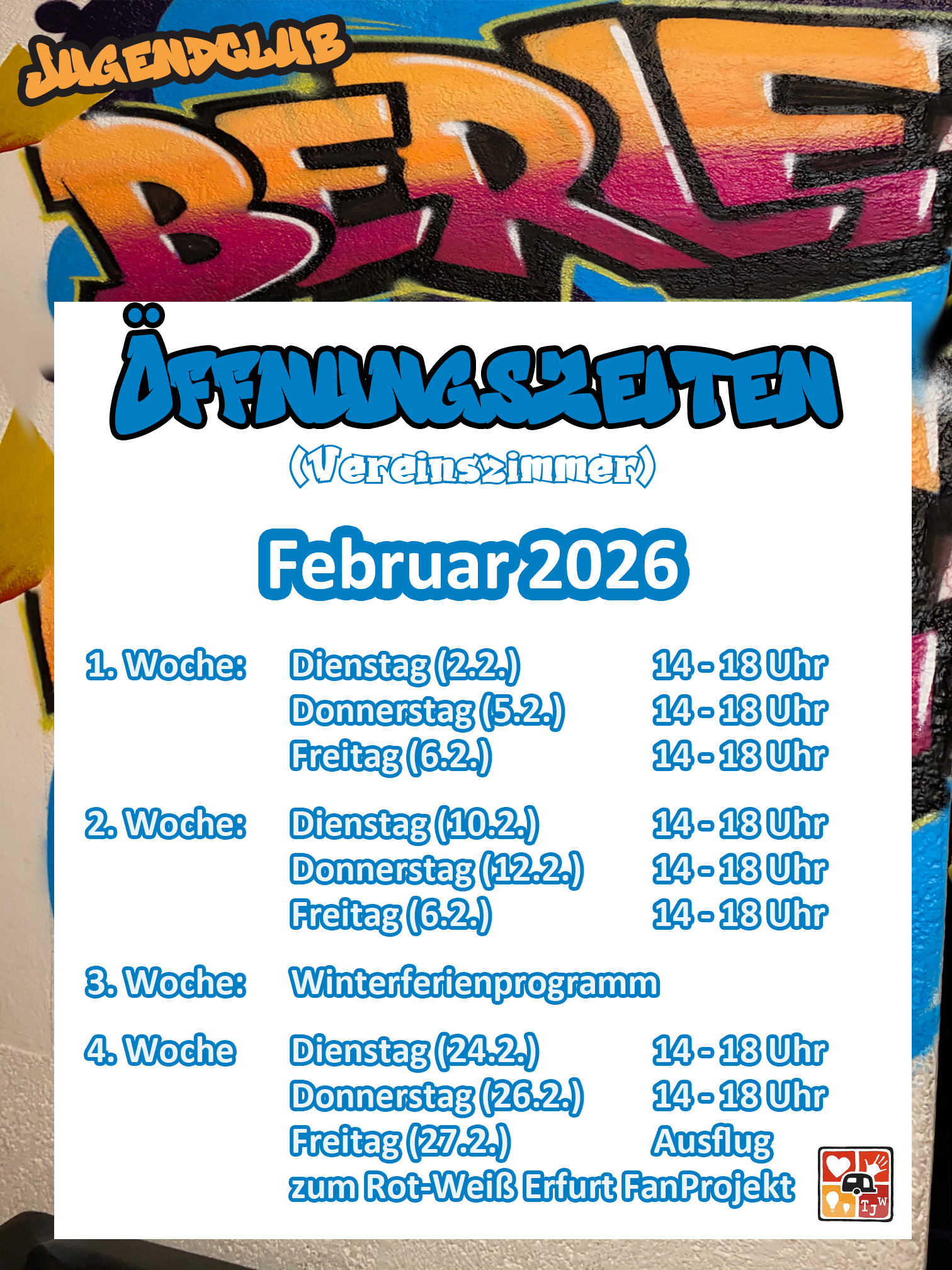 Da wir den Jugendclub mometan nicht nutzen dürfen, öffnen wir 2 in der Woche den Raum im Dorfgemeinschaftshaus Berlstedt. Die genauen Öffnungszeiten erfahrt ihr über den Aushang.