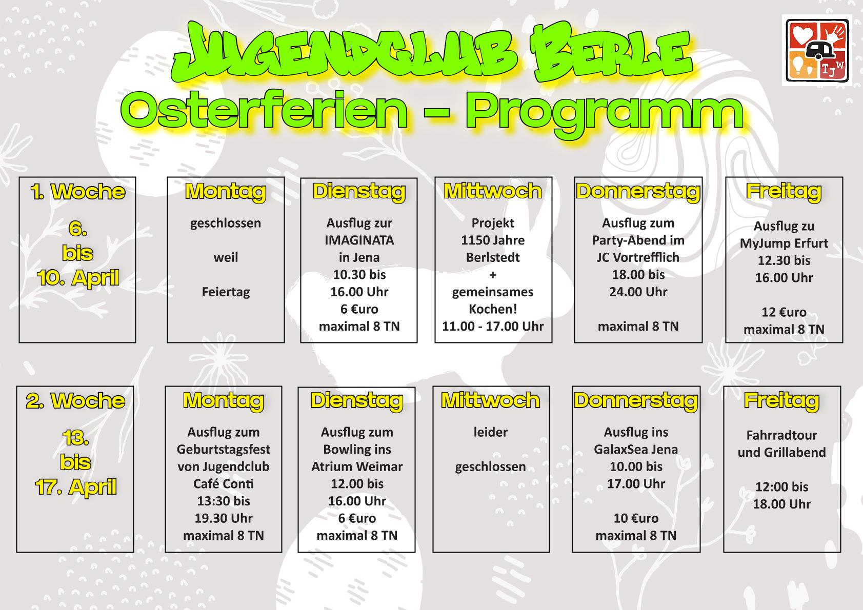 Im Nordkreis des Weimarer Landes befindet sich im Herzen von Berlstedt der Jugendclub JC-Berle. JC-Berle hat bereits sehr viele Jahre Bestand und wird seit 2018 vom Team Jugendarbeit Weimar betreut. Im JC-Berle können Kinder und Jugendliche im Alter von 10 – 21 Jahren ihre Freizeit verbringen und gestalten. Neben den täglichen Angeboten wie Dart, Kickern, Brettspiele, Quatschen oder Chillen finden auch regelmäßige Ausflüge, Ferienfreizeiten u.v.m. statt. Wir freuen uns über euren Besuch und haben immer ein offenes Ohr für eure Wünsche, Anregungen und Bedarfe.